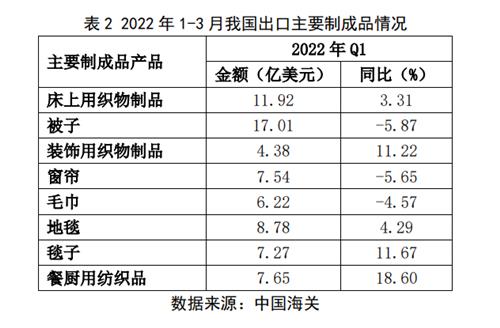 2022年以来,在全球经济复苏进程减缓、国内疫情多点散发导致的物流受限、原料价格高企等因素影响下,家纺行业一季度运行稳中承压,全国规模以上家纺企业营业收入与上年同期基本持平,利润比上年有所下降,增加行业运行发展压力。另据海关数据显示,一季度我国家纺出口呈持续增长态势,出口量价齐增,产品单价增长起到主要作用。