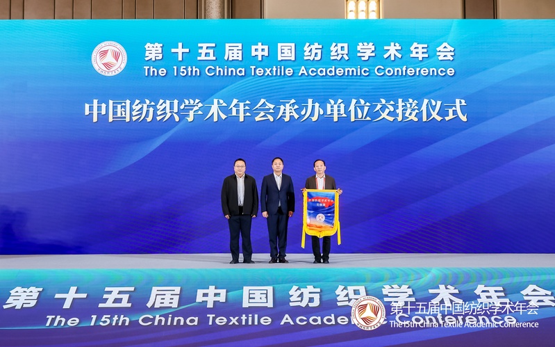 主会场最后进行了中国纺织学术年会承办单位交接仪式。伏广伟从第十五届中国纺织学术年会承办单位南通大学副校长华亮手中接过年会旗,转交给第十六届中国纺织学术年会承办单位武汉纺织大学副校长冯军。