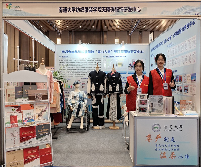 展会现场,团队以沉浸式场景呈现“翼心衣意”团队的无障碍服装创新成果:脊髓损伤患者专用套装采用磁吸联动开合系统,单手即可完成穿脱;蓝印花布元素社交服饰暗藏关节助力结构,将传统盘扣升级为力学支点;粉色多用护理服在赋能照护人员便捷性的同时完成了对“病号服”的去标签化;抗菌、透湿、温敏、祛味等功能性面料立体呈现“科技织就尊严”的科研理念。团队多项展品均突破了传统老年服饰的功能局限,吸引众多康养企业驻足洽谈。据团队负责人张玺儿介绍,该系列已申请国家外观及发明专利26项,并计划在南通市各社区开展应用测试。